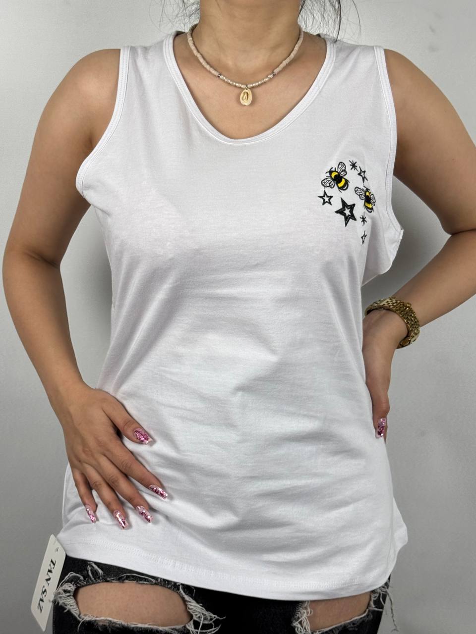 تاپ پنبه چاپ:گلدوزی زنبور جنس:۱۰۰٪ پنبه سایز:۳۸الی۵۲ پک ۱۰تایی ۱۰ رنگتماس بگیرید