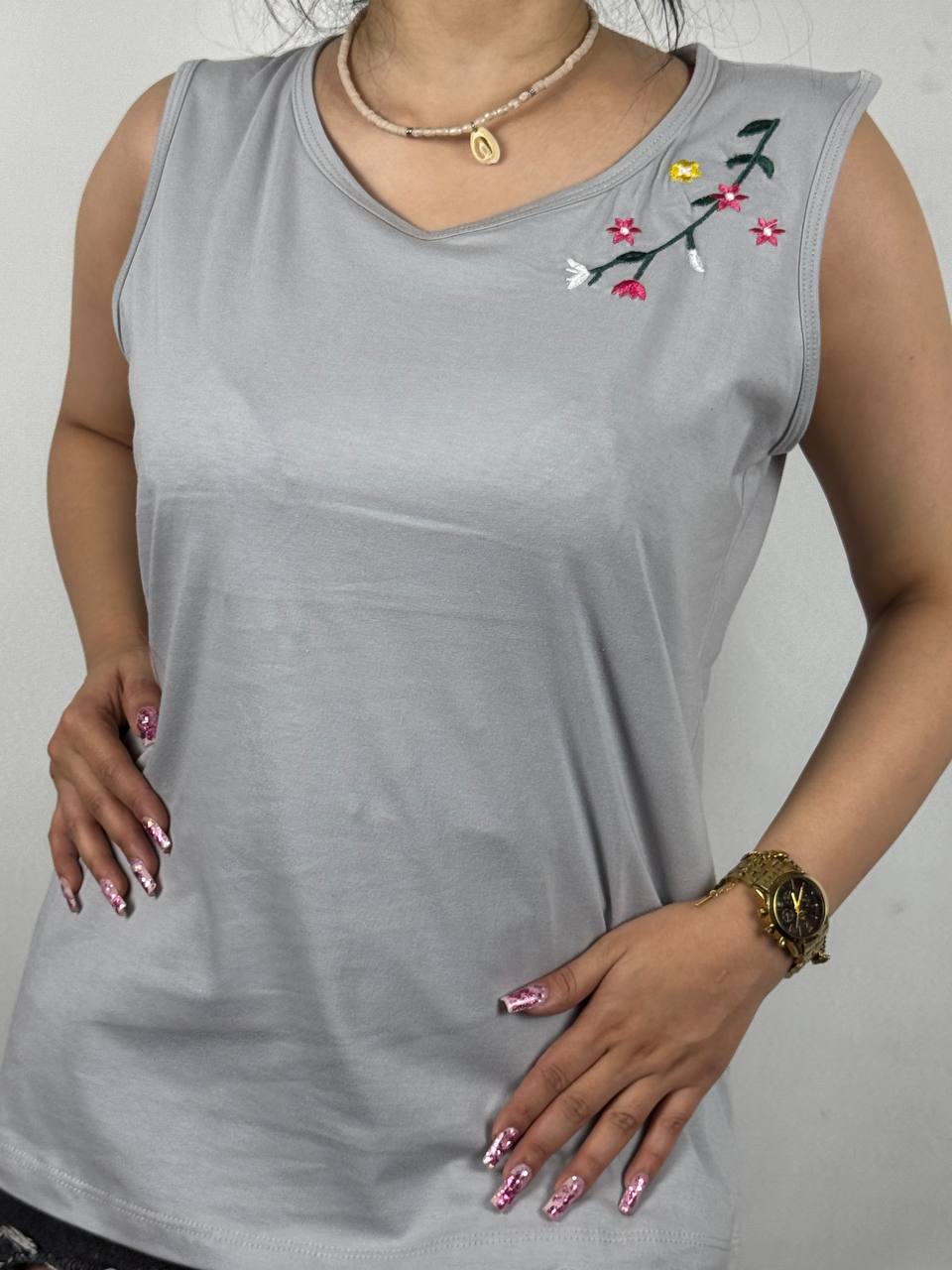 تاپ پنبه چاپ:گلدوزی سرشانه گل جنس:۱۰۰٪ پنبه سایز:۳۸الی۵۲ پک ۱۰تایی ۱۰ رنگتماس بگیرید